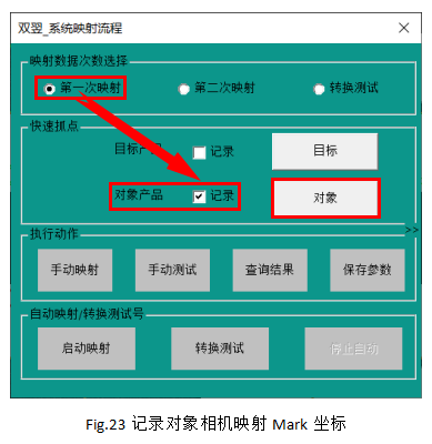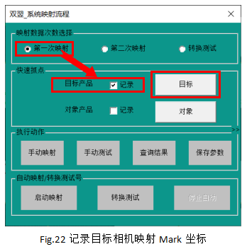 1) 系統(tǒng)全體停止的狀態(tài)下,將映射產(chǎn)品搬運到目標(biāo)相機下,打開映射界面,勾選第一次映射,再勾選目標(biāo)產(chǎn)品“記錄”,點擊“目標(biāo)”按鈕,系統(tǒng)會抓取Mark點的坐標(biāo)。
