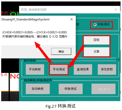 6) 勾選轉(zhuǎn)換測試,再做第三次交接,步驟同上,抓點OK后點擊手動測試。CH數(shù)據(jù)需要在【-3~3】范圍內(nèi)才算映射合格。代表產(chǎn)品交接穩(wěn)定,否則需要檢查抓點問題和機構(gòu)交接的穩(wěn)定性問題。