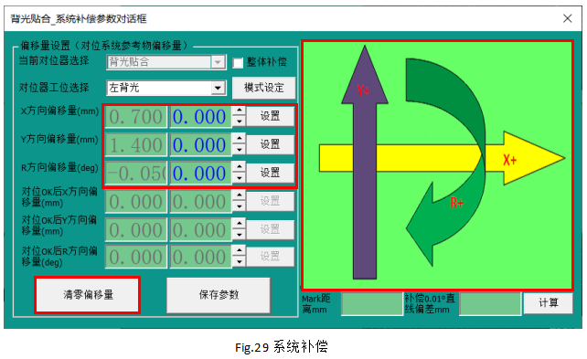 根據(jù)補償方向圖示,在右側(cè)對應(yīng)的方向補償寫入補償數(shù)值后,點擊“設(shè)置”累加到左側(cè)的總補償參數(shù)中。設(shè)置完補償參數(shù)退出前必須要點擊“保存參數(shù)”,補償才能生效。