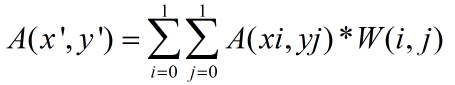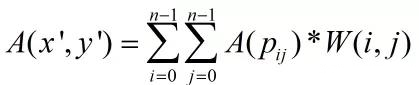 常見的插值算法有最鄰近插值、雙線性插值、雙三次插值,不管什么插值算法,其本質(zhì)都是取浮點(diǎn)型坐標(biāo)點(diǎn)周圍的n*n個(gè)整型坐標(biāo)點(diǎn)的像素值進(jìn)行加權(quán)和,從而得到該浮點(diǎn)型坐標(biāo)點(diǎn)的像素值,如下式: