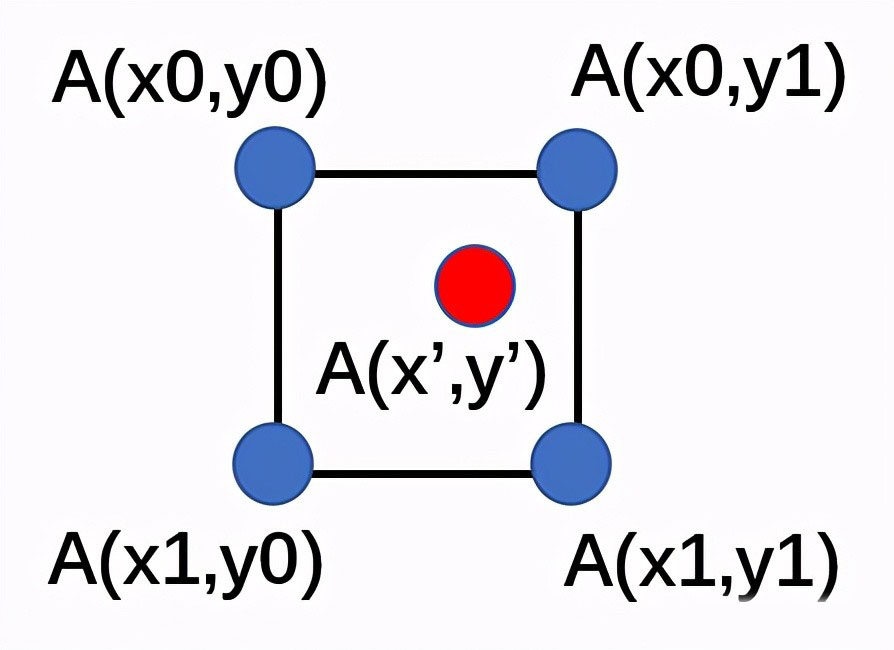 所謂插值,就是使用浮點(diǎn)型坐標(biāo)點(diǎn)的周圍整型點(diǎn)的像素值來計(jì)算該浮點(diǎn)型坐標(biāo)點(diǎn)的像素值。比如上圖中,點(diǎn)(x', y')為浮點(diǎn)型坐標(biāo)點(diǎn),使用其周圍整型點(diǎn)p0、p1、p2、p3的像素值來計(jì)算其像素值A(chǔ)(x', y'),這個(gè)過程就是插值。