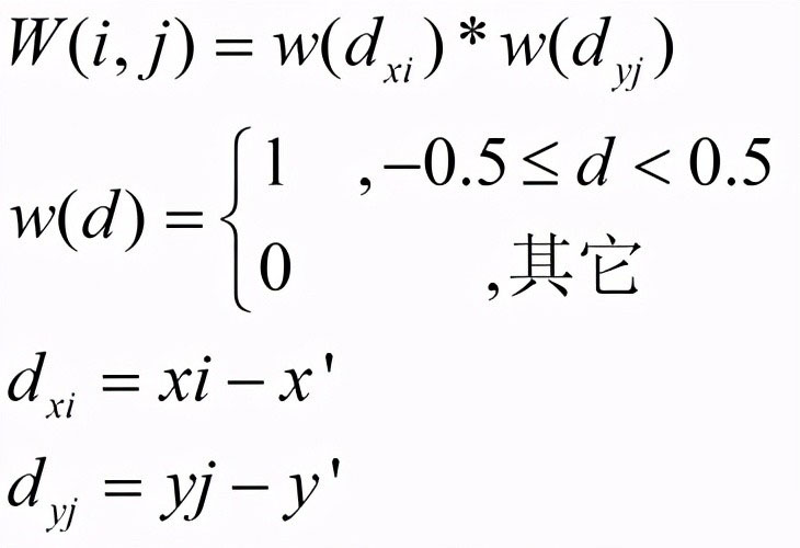 不同插值算法的區(qū)別在于權(quán)重W的計(jì)算不一樣,下文將分別詳細(xì)講解最鄰近插值、雙線性插值、雙三次插值的計(jì)算原理與實(shí)現(xiàn)。