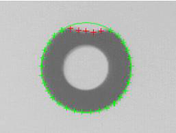 差異點(diǎn)是遠(yuǎn)離有效點(diǎn)集合的點(diǎn),它的出現(xiàn)會(huì)影響形狀(直線、圓、矩形)的逼近程度,需要將其剔除。下圖所示為剔除圓上的差異點(diǎn):