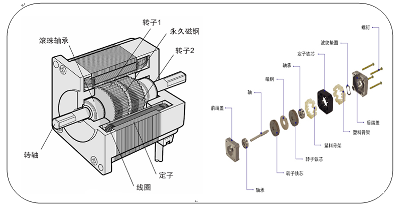 步進(jìn)電機(jī)構(gòu)造由轉(zhuǎn)子(轉(zhuǎn)子鐵芯、永磁體、轉(zhuǎn)軸、滾珠軸承),定子(繞組、定子鐵芯),前后端蓋等組成。最典型兩相混合式步進(jìn)電機(jī)的定子有8個(gè)大齒,40個(gè)小齒,轉(zhuǎn)子有50個(gè)小齒;三相電機(jī)的定子有9個(gè)大齒,45個(gè)小齒,轉(zhuǎn)子有50個(gè)小齒。