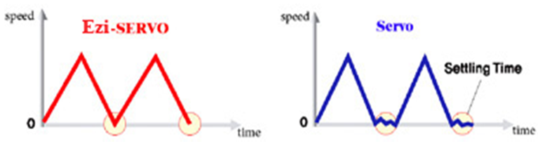 如同一般常見(jiàn)的步進(jìn)馬達(dá),Ezi-SERVO有非常好的同步性,接受命令PULSE,非??焖俚姆磻?yīng)達(dá)到定位的動(dòng)作,Ezi-SERVO的特性是使用在短距離快速定位的應(yīng)用,尤其如果是用傳統(tǒng)的伺服馬達(dá),它接受命令之后會(huì)有一個(gè)補(bǔ)償?shù)难舆t時(shí)間,所以它必須等待定位完了之后,才能執(zhí)行下面一個(gè)動(dòng)作,這個(gè)動(dòng)作我們稱(chēng)為"整定時(shí)間"。