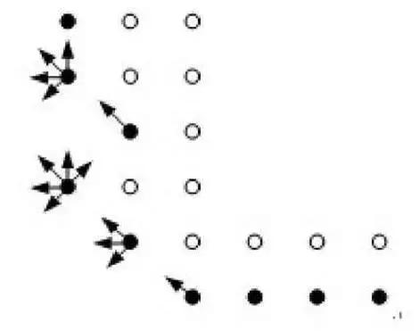 跟蹤準則:按起始點選取準則找到最左下方位的邊界點后,以其為起始點,定義左上方為初始搜索方向,若該方向的點為黑點(特征點),則判其為邊界點,否則沿順時針方向旋轉(zhuǎn)搜索方向45度,依此類推,直到搜索到第一個黑點(特征點)為止,然后再把該黑點(特征點)作為新的邊界點,逆時針方向旋轉(zhuǎn)當前搜索方向90度,用相同的方法繼續(xù)搜索下一個黑點(特征點),直到找到初始邊界點為止。若用箭頭表示搜索方向,那么該輪廓跟蹤算法可以用圖表示。