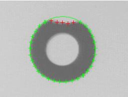 差異點(diǎn)是遠(yuǎn)離有效點(diǎn)集合的點(diǎn),它的出現(xiàn)會影響形狀(直線、圓、矩形)的逼近程度,需要將其剔除。下圖所示為剔除圓上的差異點(diǎn):