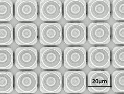 圖3.有源矩陣microLED微顯示器上的20μm間距像素陣列。