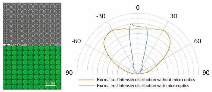 圖5. 集成在有源矩陣microLED微顯示器面板上的微光學(xué)器件以及測(cè)量的具有/不具有微光學(xué)器件的發(fā)光角度分布。
