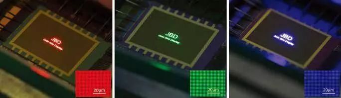 圖2.封裝好的紅色,綠色和藍(lán)色有源矩陣microLED微顯示器。