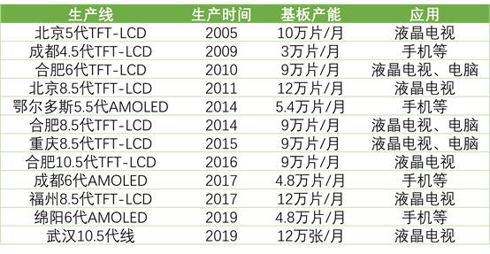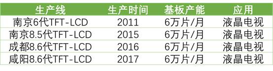 合肥第6代TFT-LCD生產(chǎn)線,年產(chǎn)1500萬片37英寸以下電視和電腦顯示器用液晶顯示屏;北京第8.5代TFT-LCD生產(chǎn)線,年產(chǎn)1300萬片26英寸至55英寸顯示器和液晶電視用顯示屏;重慶第8.5代TFT-LCD生產(chǎn)線,用于生產(chǎn)手機(jī)、平板電腦、筆記本電腦和電視用顯示模組。