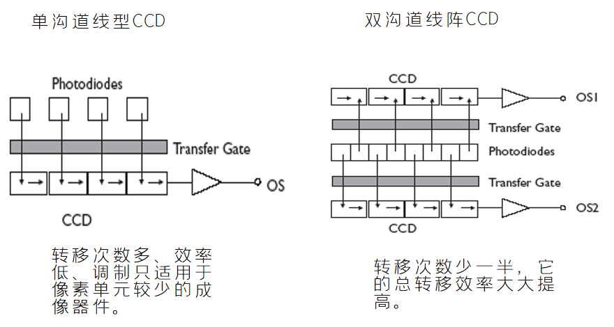 線陣CCD的構(gòu)造相對(duì)簡(jiǎn)單,只是單行的感光和轉(zhuǎn)移。