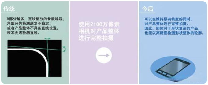 1.R部分較多的產(chǎn)品,角部分的檢測不穩(wěn)定,位置檢測也不穩(wěn)定。只要用2100萬像素相機(jī)對產(chǎn)品整體進(jìn)行完整拍攝,即使形狀復(fù)雜,也能實現(xiàn)高精度的輪廓檢測。對于形狀多樣的產(chǎn)品,也能實現(xiàn)高精度的對準(zhǔn)。