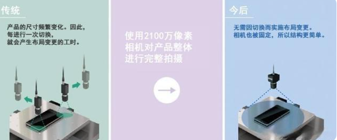2.同一生產(chǎn)線上會生產(chǎn)多種產(chǎn)品,存在切換的麻煩。所用的相機(jī)分辨率較低時,要實現(xiàn)目標(biāo)精度,就必須將拍攝視野變窄。所以,在同一生產(chǎn)線上實施多項生產(chǎn)時,每進(jìn)行一次切換,會同時產(chǎn)生相機(jī)布局變更的工時。但只要用2100萬像素相機(jī)對產(chǎn)品整體進(jìn)行完整拍攝,就能免除切換的工時,可固定使用相機(jī),能夠構(gòu)建起簡單的生產(chǎn)系統(tǒng)。此外,可以統(tǒng)一進(jìn)行多種產(chǎn)品的檢測。