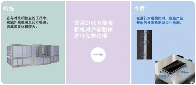 3.在與對準(zhǔn)相獨立的工序中,實施利用視覺系統(tǒng)的外觀/尺寸檢測 。除了對準(zhǔn),在其他獨立工序中實施外觀檢測及尺寸檢測的案例還有很多,只要用2100萬像素相機(jī)對產(chǎn)品整體進(jìn)行完整拍攝,就能同時進(jìn)行對準(zhǔn)和產(chǎn)品的整體外觀檢測。最終有助于減小生產(chǎn)設(shè)備的體積。