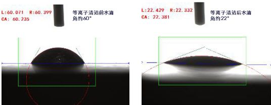 下圖5顯示一種塑膠材料等離子清潔后水滴角從約60°的變?yōu)榧s22°,活性增強。