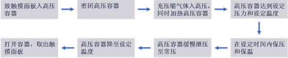 觸控膜放置在高壓、較高溫度的環(huán)境下,可以擠出膜片內(nèi)的氣體,以達到脫泡的目的。一般觸摸面板貼合后的氣泡小于2mm,再經(jīng)過脫泡機脫泡處理后,氣泡都可以消除;過大的氣泡需要先采用單點脫泡。脫泡過程如圖6所示。