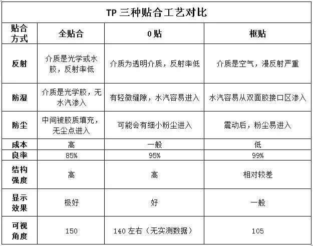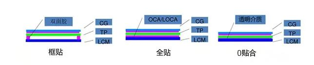觸控屏按貼合的方式可以分為全貼合和0貼合、框貼三種: