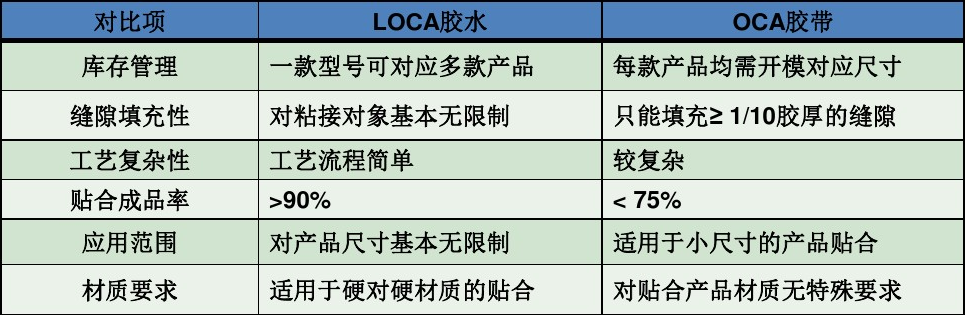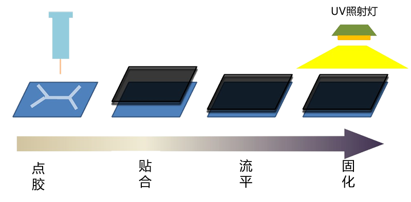 用于膠結(jié)透明光學(xué)元件(如鏡頭等)的特種粘膠劑,具有無色透明、透光率在90%以上、膠結(jié)強(qiáng)度良好,可在室溫或中溫下固化,且有固化收縮小等特點(diǎn)。當(dāng)前主要適用于小尺寸的產(chǎn)品貼合,每款產(chǎn)品均需開模,價(jià)格昂貴,貼合成本高,含光引發(fā)劑,易出現(xiàn)黃變,油墨段差處易產(chǎn)生氣泡,小尺寸厚度一般100um-200um之間。對(duì)于大尺寸而言,則貼合厚度需要達(dá)到1000um即1mm,一方面是因?yàn)榇蟪叽绲母蓴_問題,另一方面則是通過膠厚來彌補(bǔ)玻璃的不平整。