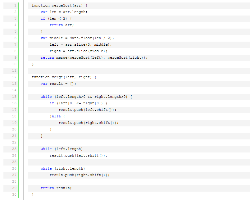 歸并排序是一種穩(wěn)定的排序方法。和選擇排序一樣,歸并排序的性能不受輸入數(shù)據(jù)的影響,但表現(xiàn)比選擇排序好的多,因?yàn)槭冀K都是O(nlogn)的時(shí)間復(fù)雜度。代價(jià)是需要額外的內(nèi)存空間。
