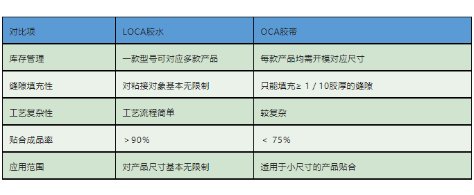 優(yōu)點:可以粘接曲面或者不平整表面材料,對油墨厚度不敏感,易返工,成本較OCA低。