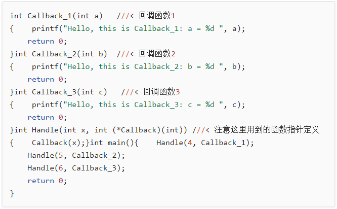 如上述代碼:可以看到,Handle()函數(shù)里面的參數(shù)是一個指針,在main()函數(shù)里調(diào)用Handle()函數(shù)的時候,給它傳入了函數(shù)Callback_1()/Callback_2()/Callback_3()的函數(shù)名,這時候的函數(shù)名就是對應(yīng)函數(shù)的指針,也就是說,回調(diào)函數(shù)其實(shí)就是函數(shù)指針的一種用法。
