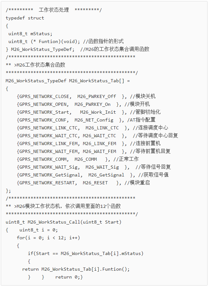 一個GPRS模塊聯(lián)網(wǎng)的小項(xiàng)目,使用過的同學(xué)大概知道2G、4G、NB等模塊要想實(shí)現(xiàn)無線聯(lián)網(wǎng)功能都需要經(jīng)歷模塊上電初始化、注冊網(wǎng)絡(luò)、查詢網(wǎng)絡(luò)信息質(zhì)量、連接服務(wù)器等步驟,這里的的例子就是,利用一個狀態(tài)機(jī)函數(shù)(根據(jù)不同狀態(tài)依次調(diào)用不同實(shí)現(xiàn)方法的函數(shù)),通過回調(diào)函數(shù)的方式依次調(diào)用不同的函數(shù),實(shí)現(xiàn)模塊聯(lián)網(wǎng)功能,如下: