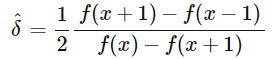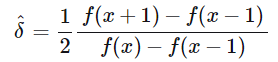 這個(gè)方法是利用極值處導(dǎo)數(shù)為0的性質(zhì),在微分濾波結(jié)果上插值得到導(dǎo)數(shù)為0的位置,因已知極值點(diǎn)在附近,因此只需在附近做微分和插值即可。插值時(shí)取極值點(diǎn)兩側(cè)正負(fù)值連線的過零點(diǎn)作為極值點(diǎn)的估計(jì),如下圖所示