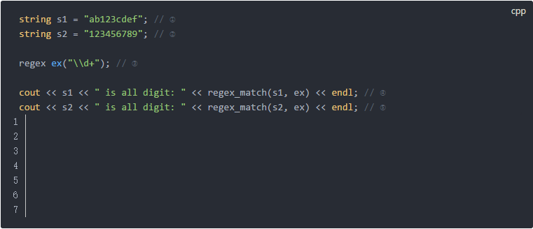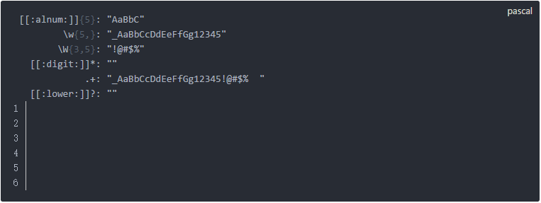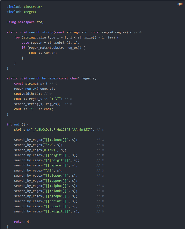 match_result用來存儲(chǔ)查找的結(jié)果。regex_search在字符串中查找匹配字符。[[:alnum:]]{5}是指:字符或者數(shù)字出現(xiàn)5次。\\w{5,}是指:字母,數(shù)字或者下劃線出現(xiàn)5次或更多次。R"(\W{3,5})"是指:非字母,數(shù)字或者下劃線出現(xiàn)3次到5次。[[:digit:]]*是指:數(shù)字出現(xiàn)任意多次。.+是指:任意字符出現(xiàn)至少1次。[[:lower:]]?是指:小寫字母出現(xiàn)0次或者1次。該程序輸出如下: