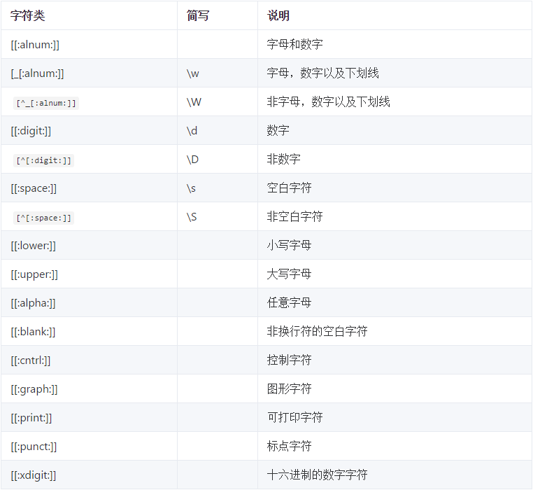 例如:1234567890這些都屬于數(shù)字字符類。除此之外,還有其他的分類,它們?nèi)缦卤硭荆?/p>