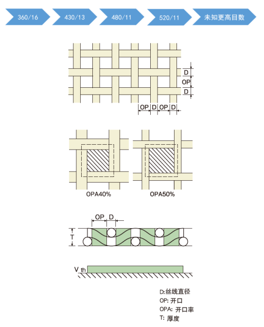 網(wǎng)紗目數(shù)為1英寸*1英寸的網(wǎng)紗內(nèi)含有的網(wǎng)目數(shù)量。目數(shù)一般可以說明絲網(wǎng)的絲與絲之間的疏密程度。目數(shù)越高絲網(wǎng)越密,網(wǎng)孔越?。环粗?,目數(shù)越低絲網(wǎng)越稀疏,網(wǎng)孔越大。網(wǎng)孔越小,漿料通過性越差,網(wǎng)孔越大,漿料通過性就越好。由于電池印刷環(huán)節(jié)中對漿料線寬的要求越來越高,因此,目前常規(guī)網(wǎng)版都有朝高目數(shù)發(fā)展的趨勢