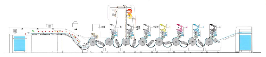 如在前面印刷完未完全干透的4色墨上(中間座4色后僅有一支UV燈管進行預(yù)固化)再印刷冷燙膠黏劑,因膠黏劑的黏度一般很大,膠黏劑是否會反拉前面的色墨、經(jīng)過冷燙座壓印時整體墨層是否會被反拉破壞、冷燙箔剝離是否完整、冷燙膠黏劑的透明性是否會對4色圖案的透底產(chǎn)生影響等情況都未知。