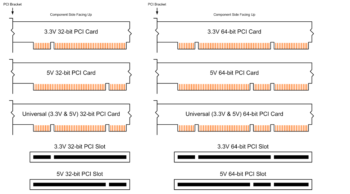 PCI有幾種不同的接口樣圖:現(xiàn)在生產(chǎn)的多為通用模式的以防插錯。還有64bit統(tǒng)一比32bit的寬出右邊缺口的部分。
