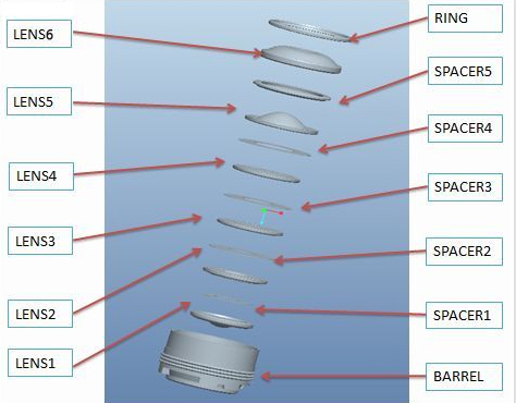 鏡頭受像素、規(guī)格、標(biāo)準(zhǔn)等要素的影響可能有4P、5P甚至6P的結(jié)構(gòu),但其主要組成仍由鏡片、隔片(隔圈)和壓圈、鏡筒組成,如下圖: