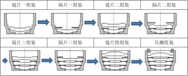 手機鏡頭組裝首先需進行鏡筒排布,而后按照圖面技術(shù)要求,按一定的部品組裝順序進行鏡片、遮光片、隔圈、壓圈等部品的組裝(其中,鏡片、壓圈組裝一般需要經(jīng)過壓入工藝),最后進行膠水涂布、膠水曝光,送入后道外觀、性能檢驗。