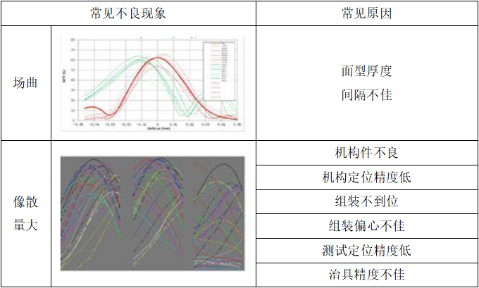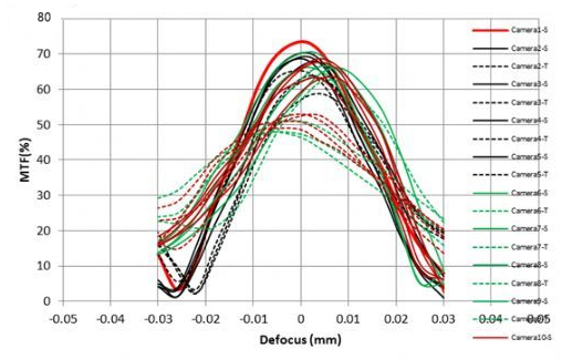 上面介紹了鏡頭的組裝過程及其要素,那么怎么去評價一顆合格的鏡頭呢?方法有很多包括解像力評價、透射偏芯檢測、場曲分析等。這里簡單介紹下較常用的離焦分析,通過以下離焦數(shù)據(jù)可以較快捷有效的分析一個鏡頭的品質(zhì),并根據(jù)其圖形形態(tài)分析原因。