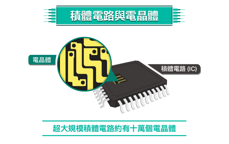 晶體管就像是數(shù)字信號的「收音機(jī)」──收音機(jī)的原理是將微弱的信號放大、用喇叭發(fā)聲出來,晶體管能將信號的電流放大;而數(shù)字信號是由0與1組成,1代表著電流「開」、0代表著電流「關(guān)」,晶體管以每秒超過 1千億次的開關(guān)來運(yùn)作,讓電流以特定方式通過。