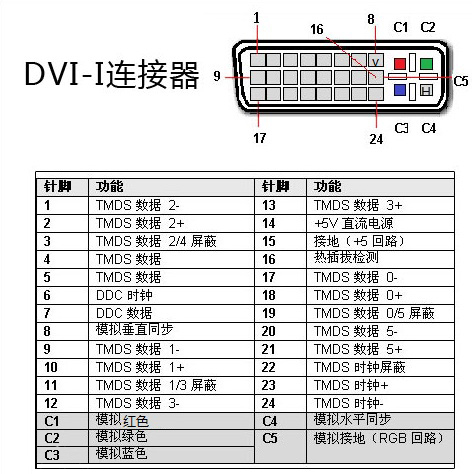 5種規(guī)格包括DVI-A(12+5)、單連接DVI-D(18+1)、雙連接DVI-D(24+1)、單連接DVI-I(18+5)、雙連接DVI-I(24+5)。
