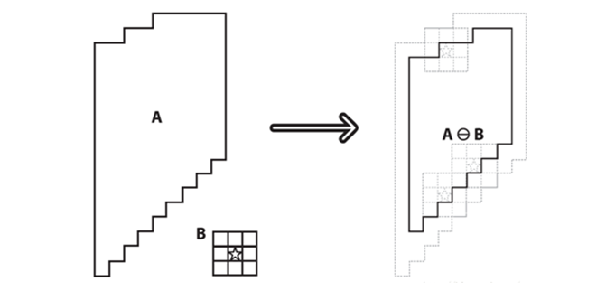 在數(shù)學(xué)形態(tài)學(xué)中,設(shè)A為(x,y)平面上一目標(biāo)區(qū)域,S為指定大小和形狀的結(jié)構(gòu)元素,定義位于坐標(biāo)(x,y)上的結(jié)構(gòu)元素S所標(biāo)識(shí)的區(qū)域?yàn)镾(x,y),那么對(duì)于A的腐蝕結(jié)果可以表示為:腐蝕的原理: