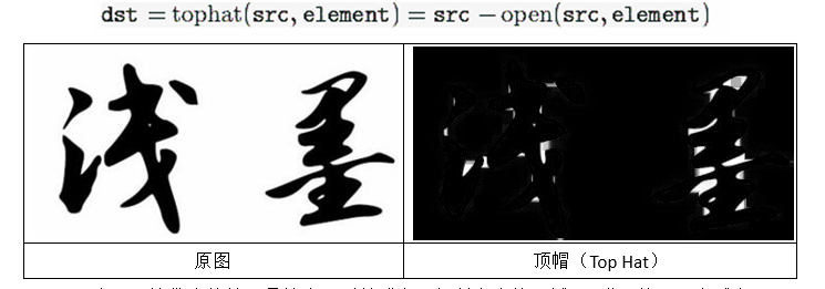 頂帽運(yùn)算(Top Hat)又常常被譯為”禮帽“運(yùn)算。為原圖像與上文剛剛介紹的“開運(yùn)算“的結(jié)果圖之差,數(shù)學(xué)表達(dá)式如下: