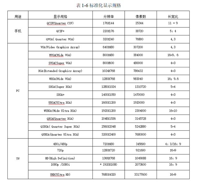 (4) 分辨率(Number of Pixels):TFT-LCD的分辨率表示有效顯示區(qū)域內(nèi)可以用做畫(huà)面顯示的發(fā)光點(diǎn)數(shù)@ ,TFT-LCD中的發(fā)光點(diǎn)稱(chēng)為像素(Pixel) O分辨率一般以乘法形式表現(xiàn),如1024X768的分辨率,其中1024表示有效顯示區(qū)域水平方向顯示的像素?cái)?shù),768表示垂直方向顯示的像素?cái)?shù)。分辨率體現(xiàn)的是有效顯示區(qū)域的像素總數(shù),分辨率越高,畫(huà)面的解析度(Resolution)也就越高。一般,人眼對(duì)垂直方向的像素?cái)?shù)更敏感。擁有更高的垂直方向分辨率,畫(huà)面 的清晰度就更高。表1-6羅列了一些基本的標(biāo)準(zhǔn)化分辨率規(guī)格。在實(shí)際使用時(shí),顯卡輸出的分辨率(屏幕分辨率)和該TFT-LCD面板的固有分辨率(物理分辨率)相同時(shí),顯示效果最好, 即所謂的"點(diǎn)對(duì)點(diǎn)”顯示。在表1-6中,公用中間分辨率格式(Common Intermediate Format, CIF)的分辨率為352X288。i是隔行掃描的英文interlace的第一個(gè)字母,p是逐行掃描的英文progressive的首字母。
