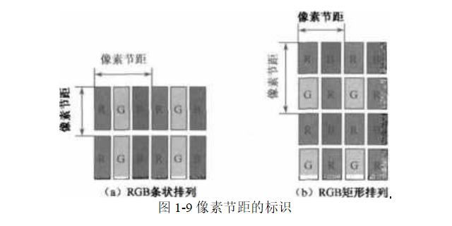 (5) 像素節(jié)距(Pixel Pitch):像素節(jié)距是TFT-LCD有效顯示區(qū)內(nèi)相鄰兩個(gè)像素間的距離,即像素重復(fù)單元的最小長(zhǎng)度。TFT-LCD的像素節(jié)距類(lèi)似于CRT的點(diǎn)距(Dot Pitch)oTFT-LCD的節(jié)距是固定的,節(jié)距的計(jì)算方式是以面板尺寸除以分辨率所得的數(shù)值,具體計(jì)算會(huì)在顯示屏設(shè)計(jì)章節(jié)中詳細(xì)介紹,對(duì)于彩色TFT-LCD而言,像素包含R、G、B三個(gè)子像素。一般,對(duì)普通的像素條狀排列方式,節(jié)距的標(biāo)識(shí)如圖l-9(a)所示。對(duì)于特殊的像素排列方式,節(jié)距的標(biāo)識(shí)不同,圖l-9(b)給出了RGB矩形排列時(shí)的節(jié)距標(biāo)識(shí)?!包c(diǎn)對(duì)點(diǎn)”顯示時(shí),像素節(jié)距 和字體的大小是對(duì)應(yīng)的,像素節(jié)距小,文字就小。畫(huà)面的細(xì)膩度也是由節(jié)距來(lái)決定的,像素節(jié) 距越小,畫(huà)面越細(xì)膩。更準(zhǔn)確地體現(xiàn)畫(huà)面細(xì)膩度的指標(biāo)是PPKPixel Per Inch)值或DPKDots Per Inch)值,即單位尺寸(25. 4mm)內(nèi)的像素?cái)?shù)目。高精細(xì)的TFT-LCD具有高PPI值(或DPI值),像素節(jié)距越小,PPI值或DPI值越大。