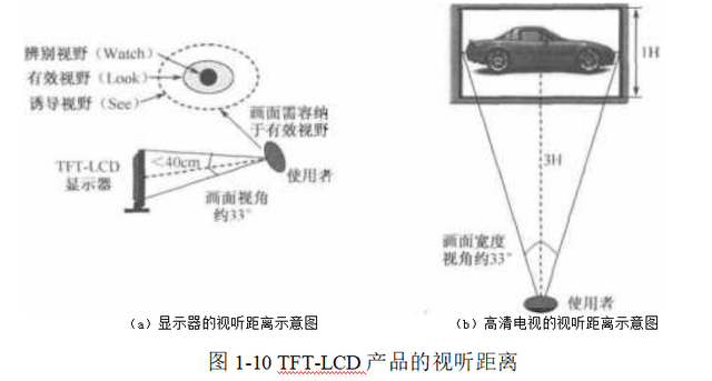 (8) 視聽(tīng)距離:在不同的應(yīng)用領(lǐng)域,TFT-LCD使用者的心態(tài)也是不一樣的。如圖l-10(a)所示,用做電腦顯示器時(shí),使用者身體前傾主動(dòng)地找內(nèi)容,人眼與顯示器的距離在40cm左右比較合適。為了讓顯示器的畫(huà)面完全容納于使用者30°36°的視野范圍以?xún)?nèi),TFT-LCD的尺寸不能過(guò)大,一般在30寸以下為宜。電腦顯示器一般用做細(xì)小的文字編輯處理,TFT-LCD的像素節(jié)距最好在0. 3mm以下。如圖l-10(b)所示,TFT-LCD用作電視,使用者身體后仰被動(dòng)地欣賞內(nèi)容,最佳的視聽(tīng)距離要同時(shí)保證觀賞到的畫(huà)面品質(zhì)和身臨其境的感覺(jué);視聽(tīng)距離太 近,畫(huà)面看起來(lái)粗糙,會(huì)造成眼疲勞。視聽(tīng)距離太遠(yuǎn),會(huì)缺少身臨其境的感覺(jué)。一般,標(biāo)清電視