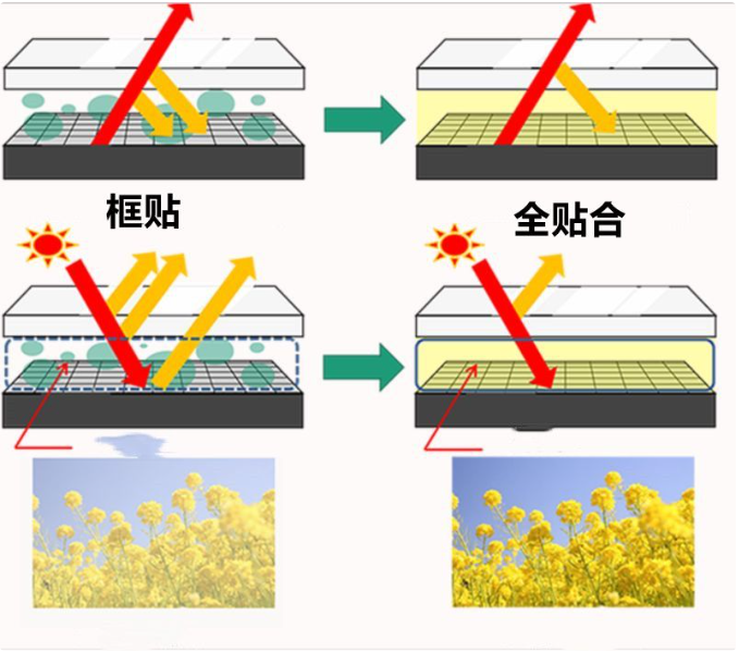 全貼合的主要優(yōu)點提高光線的透過率,減少反射,即使在強光條件和寬視角下,也能提高顯示器的可讀性和對比度。在框貼粘合中,來自外部光源的光穿過面板和空氣層(顯示器和玻璃之間),部分光被反射回來?;蛘週CD的背光通過空氣層時,也會發(fā)生同樣的事情,影響圖像的畫面質(zhì)量。