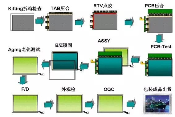 如上圖,后段Module制程主要是液晶基板的驅動IC壓合與印刷電路板的整合,這一部分可以將從主控電路接受到的顯示信號傳輸到驅動IC上,驅動液晶分子轉動,顯示圖像。此外,背光部分在此環(huán)節(jié)會與液晶基板整合,完整的液晶面板就完成了。
