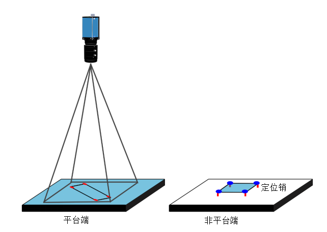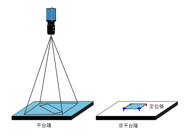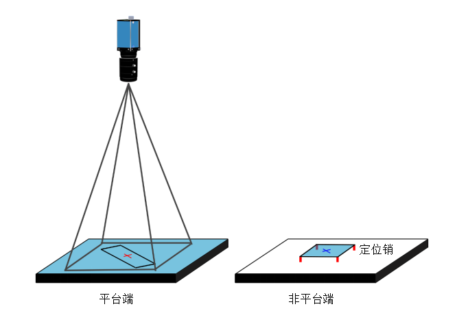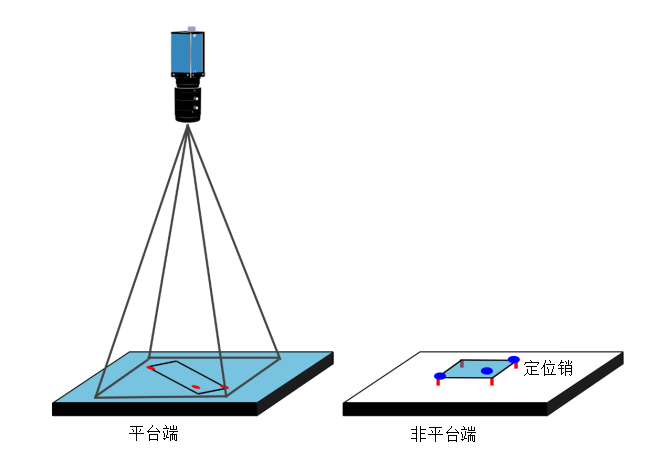 說(shuō)明:非平臺(tái)端上的產(chǎn)品通過(guò)定位銷或其他方式確保來(lái)料都是在相對(duì)固定的位置,平臺(tái)端的產(chǎn)品來(lái)料位置不固定,但是Mark與產(chǎn)品的相對(duì)位置固定,確保Mark在相機(jī)視野內(nèi)(通常是將產(chǎn)品抓起后再拍攝防止拍完再抓導(dǎo)致產(chǎn)品移動(dòng)或變形)。根據(jù)糾偏算法找到偏移量。根據(jù)偏移量將平臺(tái)端的產(chǎn)品貼到非平臺(tái)端上。
