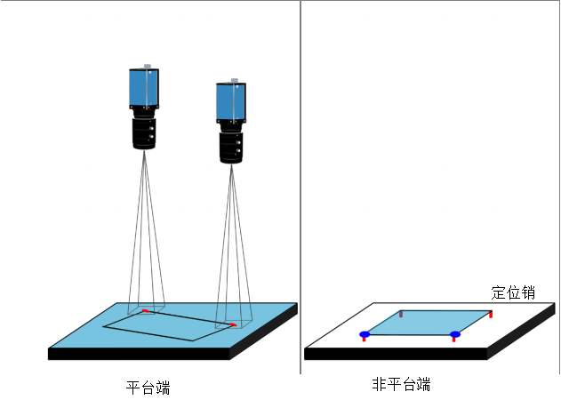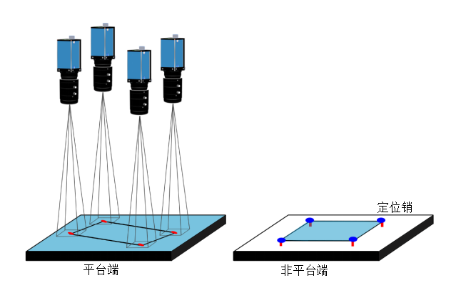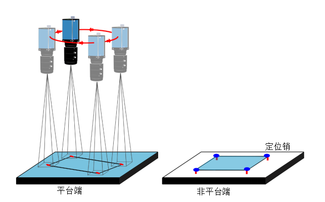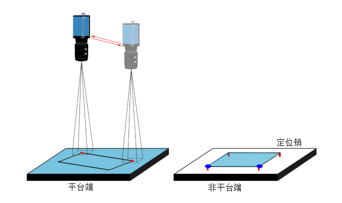 說(shuō)明:四相機(jī)抓邊自對(duì)位模型中相機(jī)都是在平臺(tái)端。四個(gè)相機(jī)模型的四個(gè)相機(jī)分別拍攝平臺(tái)端矩形產(chǎn)品的四條邊。非平臺(tái)端上的產(chǎn)品通過(guò)定位銷或其他方式確保來(lái)料都是在相對(duì)固定的位置,平臺(tái)端的產(chǎn)品來(lái)料位置不固定。找出四條邊后根據(jù)糾偏算法找到偏移量,根據(jù)偏移量將平臺(tái)端的產(chǎn)品貼到非平臺(tái)端上。