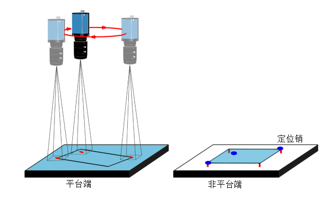 說(shuō)明:三Mark自對(duì)位有單相機(jī)和三相機(jī)兩種情況,相機(jī)都是在平臺(tái)端。單相機(jī)模型拍攝完一個(gè)交點(diǎn)后移動(dòng)位置拍攝另一個(gè)交點(diǎn),三相機(jī)模型的三個(gè)相機(jī)分別拍攝三個(gè)交點(diǎn)。非平臺(tái)端上的產(chǎn)品通過(guò)定位銷或其他方式確保來(lái)料都是在相對(duì)固定的位置,平臺(tái)端的產(chǎn)品來(lái)料位置不固定,找出三個(gè)交點(diǎn)后,根據(jù)糾偏算法找到偏移量,根據(jù)偏移量將平臺(tái)端的產(chǎn)品貼到非平臺(tái)端上。
