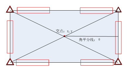 糾偏方法:四Mark對(duì)位會(huì)用到四個(gè)交點(diǎn),通常是矩形的四個(gè)角點(diǎn)。如果客戶有特殊要求,可以按照客戶要求的Mark點(diǎn)進(jìn)行對(duì)位。以矩形的四個(gè)角點(diǎn)為例:如上圖,通過(guò)直線擬合找到四條直線;找到四條直線的交點(diǎn)即矩形的四個(gè)角點(diǎn);求出對(duì)角線的交點(diǎn)坐標(biāo)定為(x,y);對(duì)角線形成夾角的角平分線的角度作為θ;x,y,θ與基準(zhǔn)的差值為偏移量。