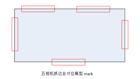 說(shuō)明:五相機(jī)抓邊自對(duì)位模型與四相機(jī)抓邊自對(duì)位模型比較接近,相機(jī)都是在平臺(tái)端。區(qū)別在于四相機(jī)抓邊模型的四個(gè)相機(jī)分別拍攝平臺(tái)端矩形產(chǎn)品的四條邊,五相機(jī)抓邊模型中有一條長(zhǎng)邊需要兩個(gè)相機(jī)分別抓一端。非平臺(tái)端上的產(chǎn)品通過(guò)定位銷或其他方式確保來(lái)料都是在相對(duì)固定的位置,平臺(tái)端的產(chǎn)品來(lái)料位置不固定。找出五條邊后,根據(jù)糾偏算法找到偏移量。根據(jù)偏移量將平臺(tái)端的產(chǎn)品貼到非平臺(tái)端上。